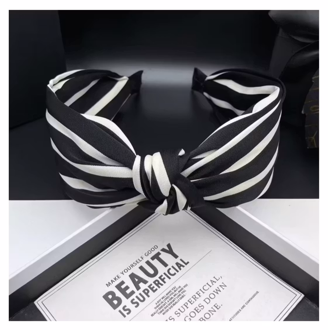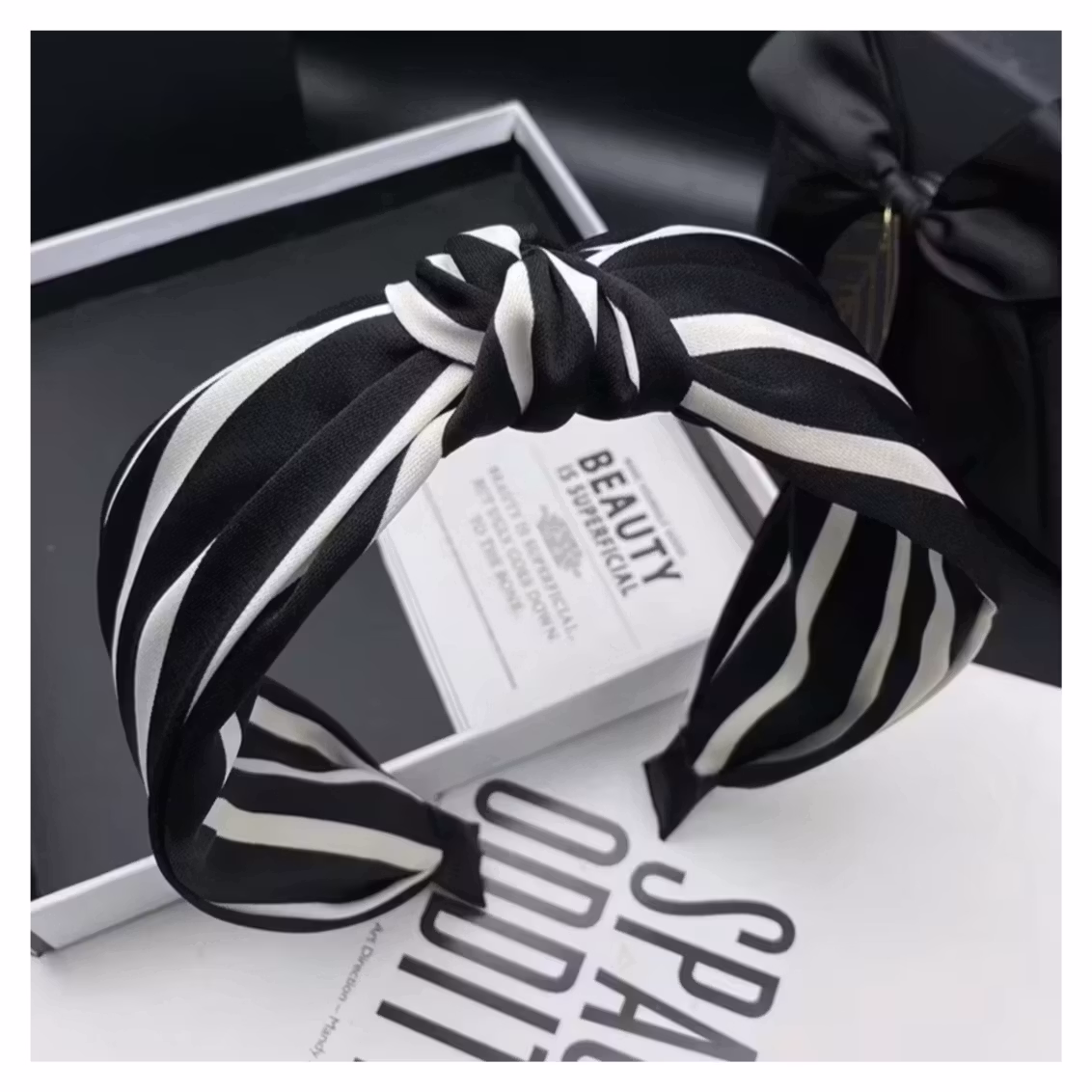 Ett dekorativt diadem med tvinnad knut och klassiskt randigt mönster i svart och vitt. Den grafiska designen skapar ett modernt och självsäker uttryck som lyfter din stil med elegant enkelhet.