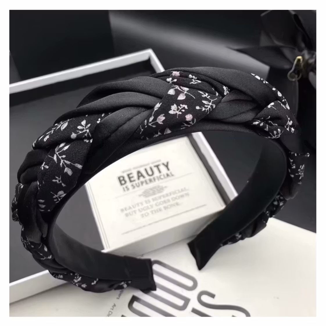 Ett elegant hårband i klassisk svart med diskret blommönster och tvinnad knut.