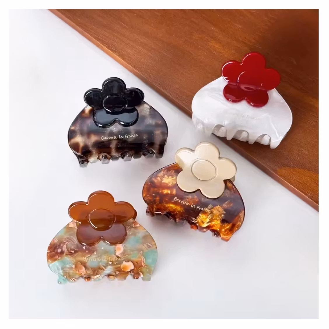 Bloomé Carmine är en elegant hårklämma med mjukt rundad form och ett dekorativt blomformat toppinslag. Den krämvita, lätt pärlemorskimrande basen möter en djup röd blomdetalj som skapar ett romantiskt men samtidigt uttrycksfullt intryck.