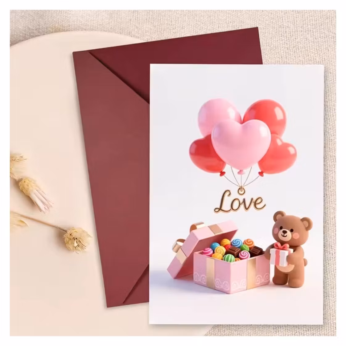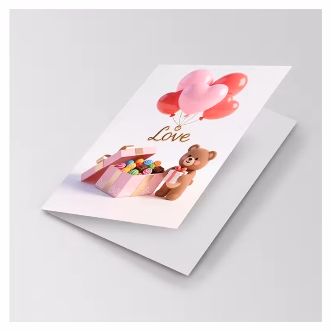Ett hjärtevärmande kort med lekfulla ballonger och en gullig nalle som sprider värme och glädje.