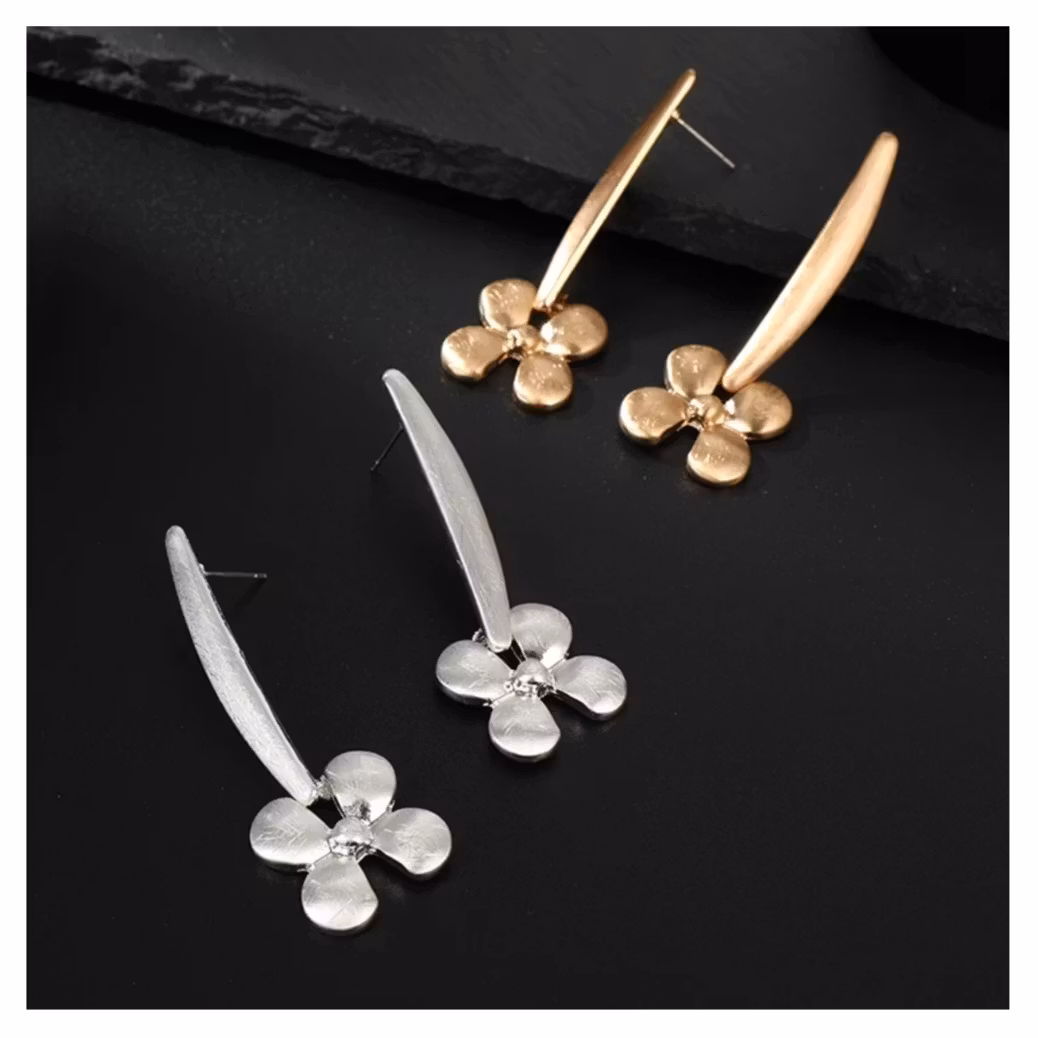 Avlånga örhängen i varm guldton med stilren blomform och mjukt böjd design.