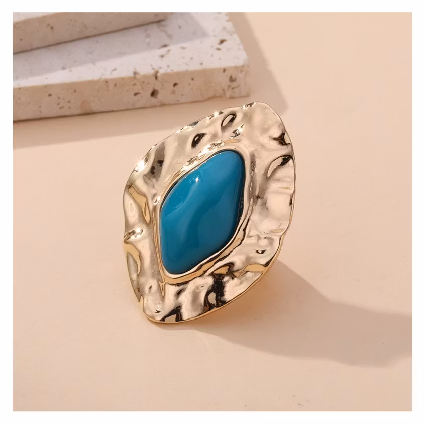 En statement-ring med organisk formad guldram och sten i djup turkos ton.