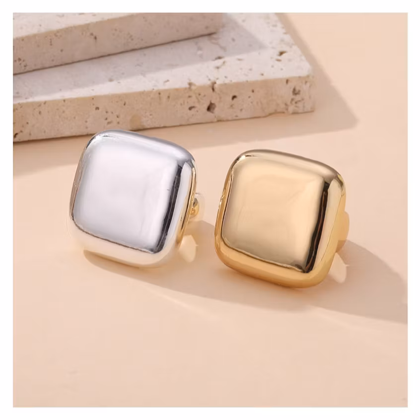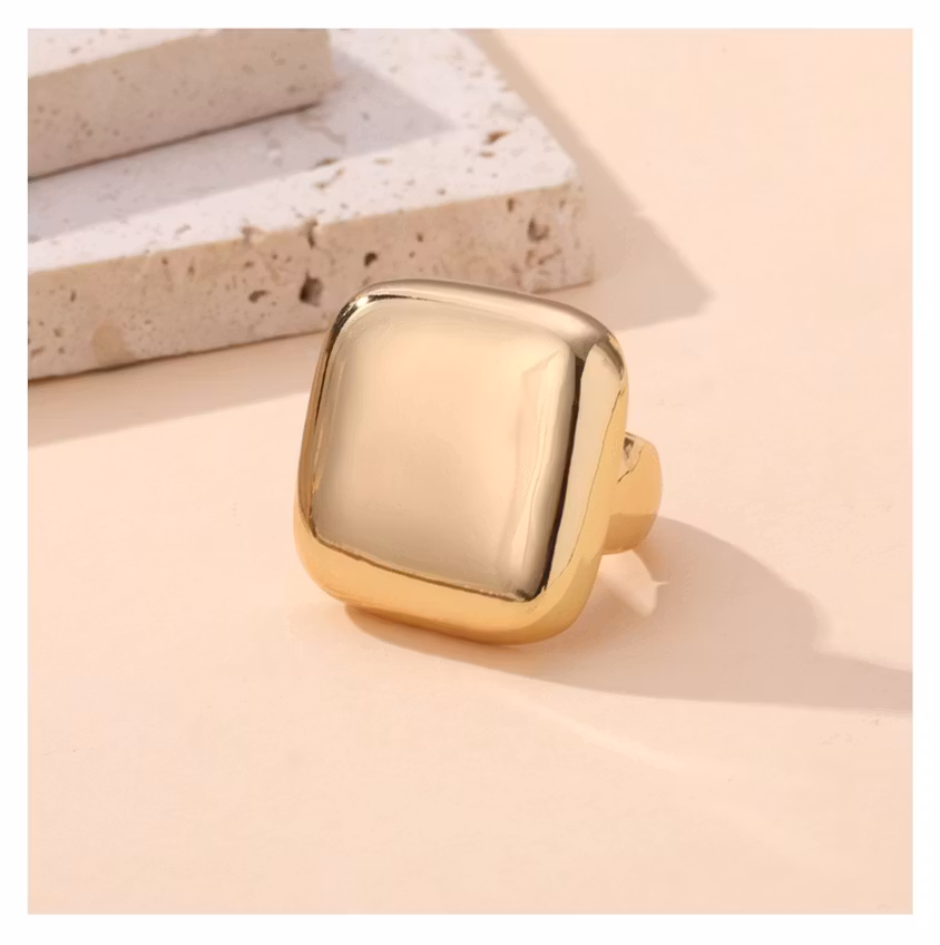 En modern statement-ring med rundad kvadratisk form i slät, blank guldfinish.