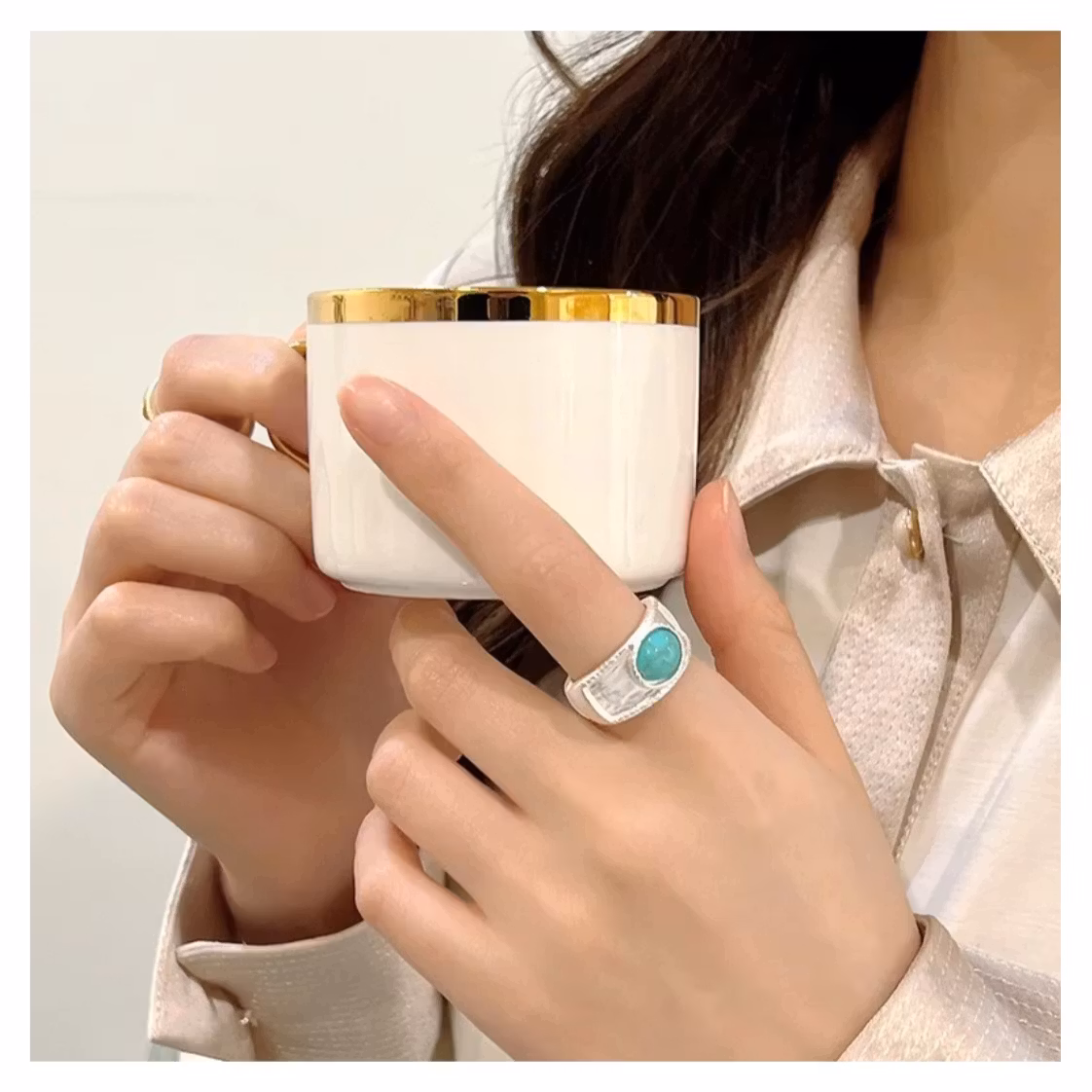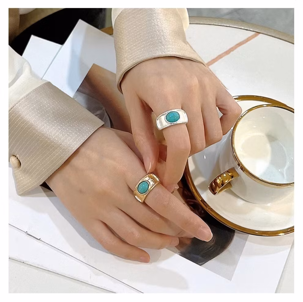 En markant ring i bred design med turkosfärgad natursten i centrum. Den blanka ytan och den markerade formen ger ett stilrent och kraftfullt uttryck – modern elegans med attityd.