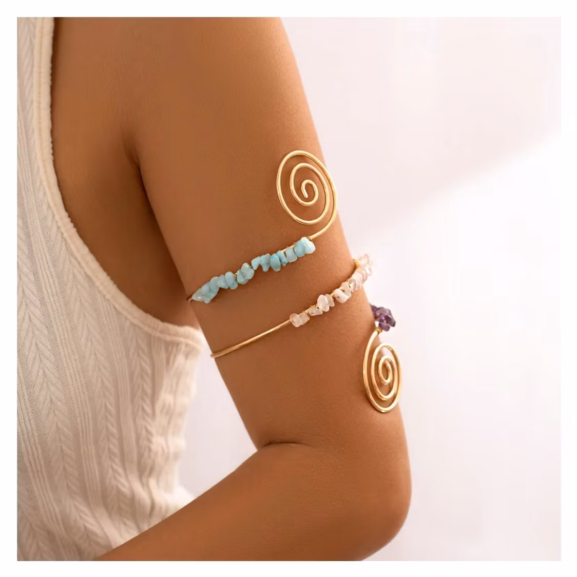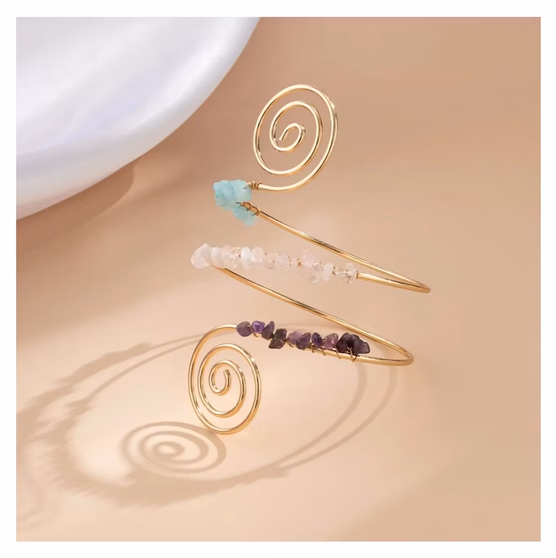 Ett exklusivt armband som elegant slingrar sig stilfullt runt överarmen och ger en unik och bohemisk känsla. De dekorativa spiralformerna tillsammans med färgade stenar skapar en modern men samtidigt avslappnad look.