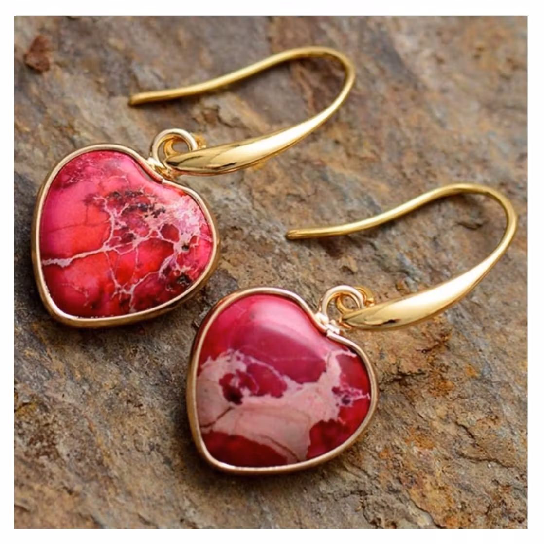 Eleganta örhängen med hjärtformade berlocker i äkta Emperor Stone – en naturlig sten inspirerad av jordens varma och levande toner. Varje sten är unik och ger smycket en mjuk, romantisk och exklusiv känsla.
