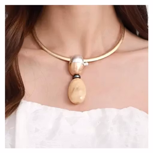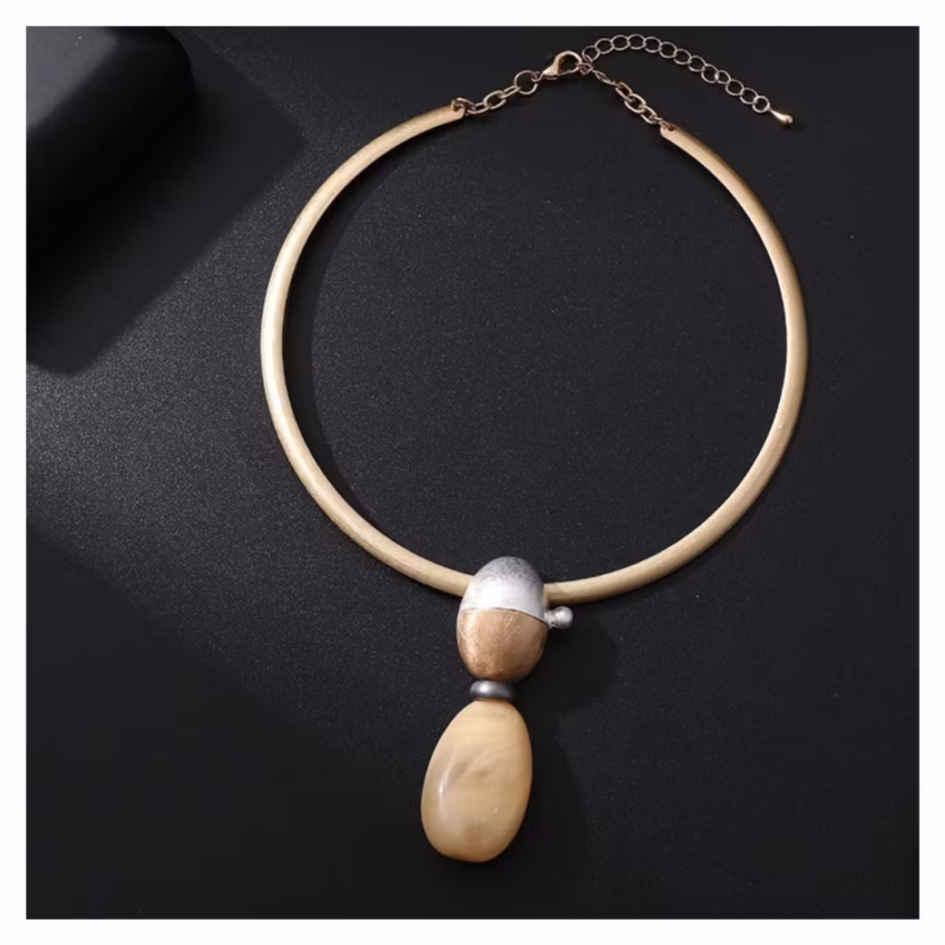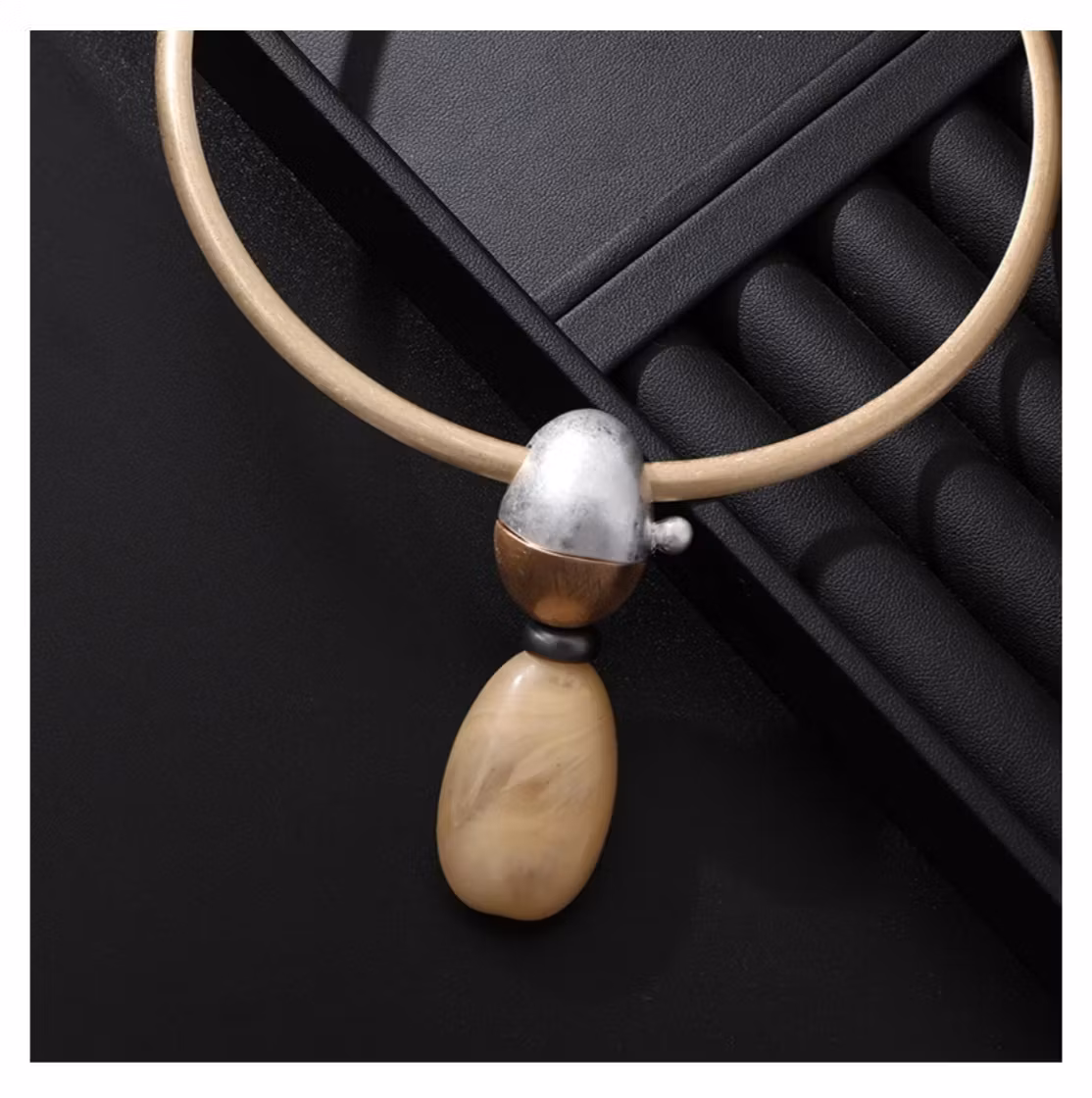 Ett statement-halsband med skulptural form och modern elegans. Den stilrena halsringen i varm ton kombineras med ett konstnärligt hänge som skapar en harmonisk helhet.