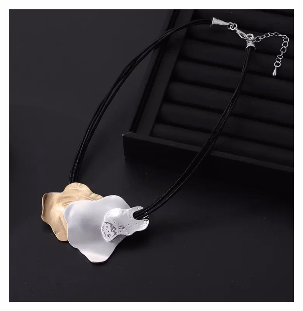 Jazara är ett elegant halsband med organiskt formade detaljer i silver- och guldfärg. Den svarta remmen skapar en modern kontrast och gör smycket bekvämt att bära hela dagen.
