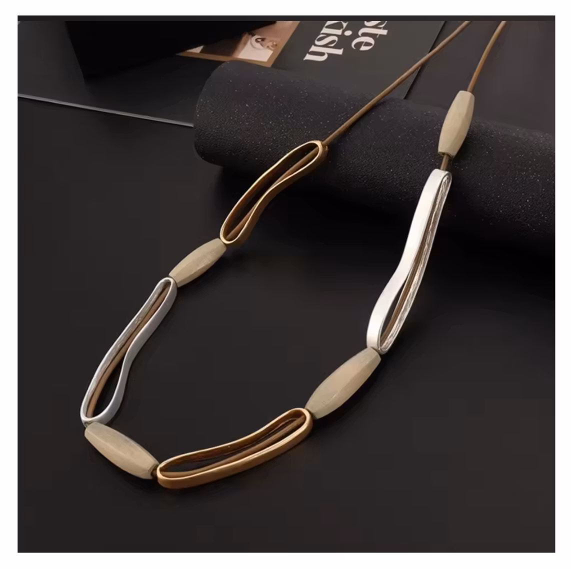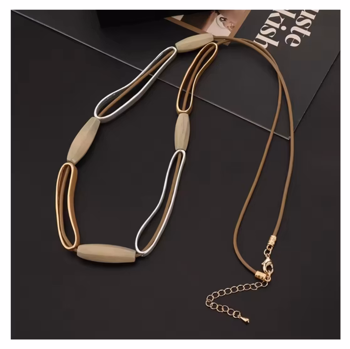 Ett exklusivt halsband med organiska former och detaljer i silver och varm guldton, kombinerat med  inslag av naturligt trä. Den harmoniska designen skapar en sofistikerad och modern helhet med en jordnära elegans.